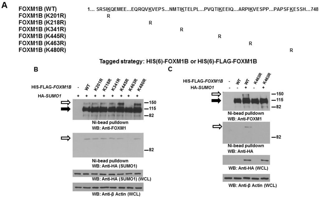 Regulation of protein function by reversible post-translational modifications such as phosphorylation, is the core principle in biochemistry and molecular and cell biology. Modifications by SUMO proteins have emerged as critical and essential events in a variety of biological processes, including cell cycle regulation, cell death, genomic instability, inflammation, metabolism, transcriptional regulation, and tumor progression. FOXM1B has been shown to be involved in cancer development and progression [,,,,,]; however, the functional significance of SUMO modification for FOXM1B remains to be clarified. In the present work, we demonstrate that the lysine residue, K463, is the major SUMO acceptor site for FOXM1B and SUMOylation is essential, at least in part, for FOXM1B-mediated transcriptional activity.
