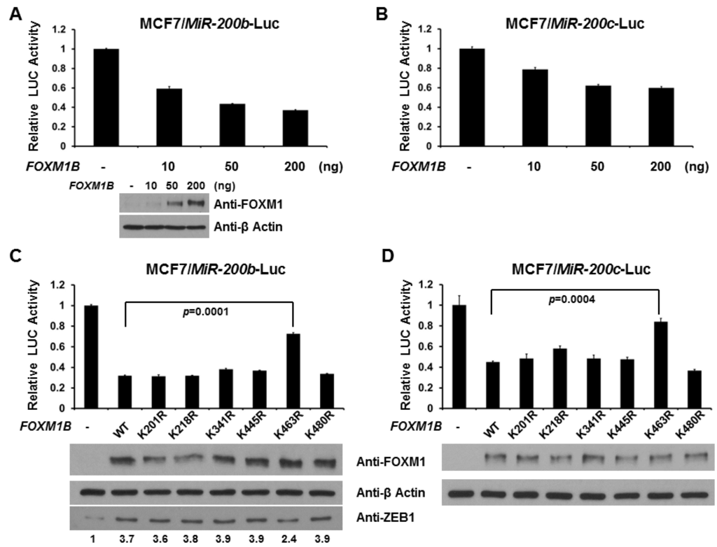 Because FOXM1 is a negative regulator of MiR-200b/c gene expression [] and to gain insight into the role of SUMOylation of FOXM1B, we assessed the effect of this modification on FOXM1B-dependent transcription using a natural MiR-200b/c promoter [,]. As can be seen in Figure 4A,B, expression of WT FOXM1B leads to a robust dose-dependent reduction in the activity of a MiR-200b (Figure 4A) and a MiR-200c (Figure 4B) promoter-driven luciferase reporter. As the K463 is the major acceptor site for SUMO in FOXM1B, we next examined whether SUMOylation at K463 is required for FOXM1B activity. As shown in Figure 4C,D, loss of SUMOylation at K463, but not other lysine sites, relieved the reduction by about 50%, suggesting that SUMOylation is required for FOXM1B activity on MiR-200b/c promoter regulation. Since MiR-200s have been demonstrated to act as a tumor suppressor by suppressing Zinc-finger enhancing binding transcription factors (ZEB1 and ZEB2) to increase the E-cadherin in cancer cells [,], we measured ZEB1 levels from the samples of reporter assays. As shown in Figure 4C, the levels of ZEB1 were increased when WT FOXM1B was expressed. However, loss of SUMOylation at K463, but not other lysine sites, reduces the increase by 43%, further suggesting that SUMO conjugation is required for FOXM1B activity on MiR-200b/c promoter regulation.