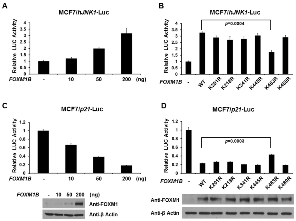 FOXM1 is involved in hallmarks of cancer by regulating numerous target genes, including JNK1, which is involved in invasion and metastasis, and p21, which is involved in cell proliferation. As shown in Figure 5A,C, FOXM1B increases JNK1 promoter activity but decreases p21 promoter activity in a dose-dependent manner. This data is consistent with the previous findings [,]. Therefore, we next tested whether SUMO modification of FOXM1B alters JNK1 and p21 promoter activities. Loss of SUMOylation at K463, but not other lysine sites, decreased FOXM1B-mediated JNK1 promoter activity by about 50% (Figure 5B). In Figure 5D, loss of SUMOylation at K463 on FOXM1B, but not other lysine sites, relieved the reduction of p21 promoter activity by about 25%. Taken together, these results provide strong evidence that SUMOylation of FOXM1B at K463 is critical for transcriptional activity of FOXM1B.