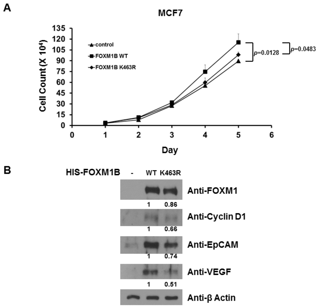Removal of SUMOylation reduces FOXM1B-mediated cellular proliferation. (A) Cell numbers were determined in indicated time after plating of WT FOXM1B-expressed or K463R FOXM1B-expressed MCF7 cells by cell counting assay. On day 5, p values were determined; (B) On day 5, the expression levels of FOXM1B, Cyclin D1, EpCAM, VEGF (vascular endothelial growth factor), and β-Actin in MCF7 cells were validated using anti-FOXM1, anti-Cyclin D1, anti-EpCAM, anti-VEGF, and anti-β-Actin immunoblotting, respectively. Experiments were performed two times with similar results.