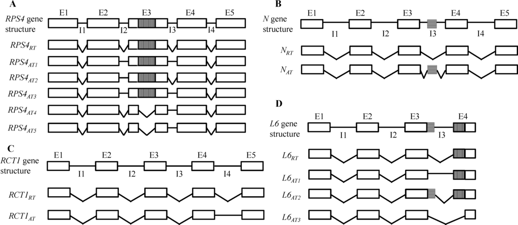 Schematic diagramof gene structure and transcript isoforms for the TIR-NBS-LRR genes Arabidopsis RPS4 (A); tobacco N (B); M. truncatula RCT1 (C); and flax L6 (D). Exons are shown as boxes. The cryptic introns are indicated by vertically hatched boxes in the exons, and horizontally hatched boxes for cryptic exons in introns. The spliced and retained introns are shown as angled and straight lines, respectively. RT, regular transcript encoding the full-length protein product; AT, alternative transcript encoding an aberrant protein product; E, exon; I, intron.