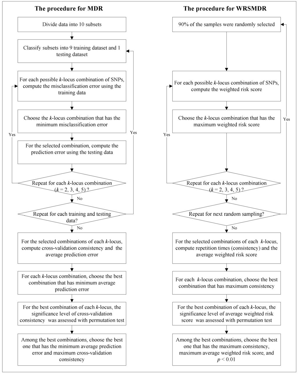 Instead of performing a direct search of the multi-locus combinations with the maximum score among the SNP set, which is liable to result in some false-positive loci in the detected multi-locus combinations, we used a random sampling method to repress noise in the identification of the susceptibility of multi-locus combinations. This procedure included three steps. In Step 1, 90% of the samples were randomly selected. The weighted risk scores of k-locus combinations (k ϵ {2,3,4,5}) were computed based on the randomly selected samples, and the combination with the maximum score within each of the k-locus combinations was selected. After ten repeats for each k-locus combination, the multi-locus combination that demonstrated the maximum consistency, that is, the one appearing most frequently, was chosen as the candidate susceptibility k-locus combination. The average score of each of the selected k-locus combinations was then computed; In Step 2, the significance level of each candidate k-locus combination was assessed with the permutation test. Specifically, for every 1000 permutation datasets simulating the null hypothesis of no association, the weighted risk score of the multi-locus combination was computed using the above method. The p-value was then determined according to the proportion of the permutation datasets with a greater weighted risk score than the average score. The null hypothesis was rejected when the Monte Carlo p-value derived from the permutation test was less than 0.01; In Step 3, among the candidate locus combinations, the one with p < 0.01, the maximum consistency, and the maximum average weighted risk score was selected as the final susceptibility multi-locus combination. Figure 1 describes the procedure of the WRSMDR and MDR methods. Additional details describing the MDR method are available in the literature [5,6,7,8,9,10].