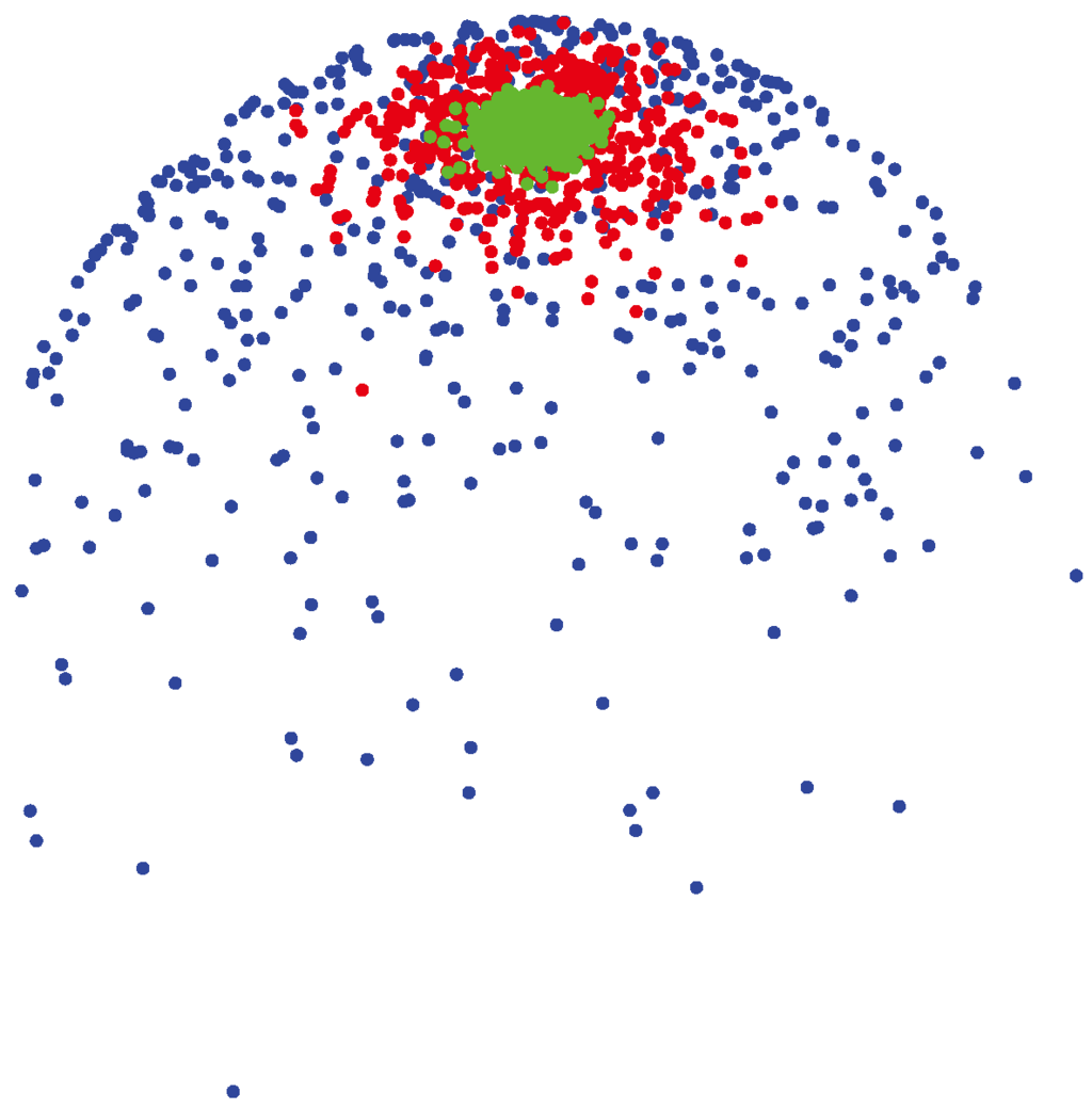 (μ, 400) (shown by green colors) are highly concentrated around the mean direction, while for samples generated from