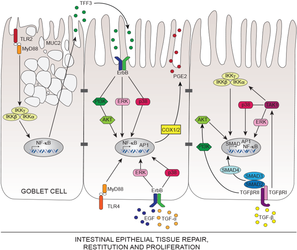 Multiple regulatory growth factors, immunoregulatory cytokines and peptides control intestinal wound healing by either impacting the restitution or the proliferation processes. Many of these factors promote tissue repair by enhanced production of bioactive TGF-β [98], however some other factors such as trefoil factors (TFF) and galectins promote wound healing in a TGF-β-independent mechanism [99,100]. Galectins are a family of β-galactoside binding lectins of which Galectins-2, -3 and -4 are expressed in IECs supporting cell migration and wound re-epithelialization [100,101]. Recent discoveries show that Galectin-3 levels are impaired in IBD patients and propose that Matrix metalloproteinase-7 (MMP7) cleaves Galectin-3 during intestinal inflammation hampering its tissue repair functions [102]. TFF, small protease-resistant peptides secreted by Goblet cells, play critical roles in intestinal homeostasis through potentiating epithelial restitution [99,103,104]. For instance, TFF3 deficiency renders mice highly susceptible to DSS-induced colitis due to an impaired mucosal protection [105]. Moreover, administration of human hTFF2 and transgenic overexpression of hTFF1 accelerate mucosal healing and decrease inflammation during experimental models of colitis [106,107,108,109]. So far no specific TFF receptor was described, however in vitro evidence put forward the idea that TFF3 induces the transactivation of ErbB family members of receptor tyrosine kinases, including epidermal growth factor receptor (EGFR/ErbB1) and ErbB2, and enhances IEC survival and proliferation in a p38 mitogen activated protein kinase (MAPK)- as well as phosphoinositol 3-kinase (PI3K)-dependent manner [110,111,112] (Figure 1). Additionally, tumor necrosis factor (TNF)-α and nuclear factor-kappa B (NF-κB) repress the transcription of intestinal TFF3 in vitro; suggesting that perpetual activation of NF-κB in the intestinal mucosa of IBD patients may promote ulcerations and hence decrease TFF3-dependent tissue repair [113]. It appears that NF-κB, master regulator of inflammation [114], has tissue-protective functions in the intestine as IEC-specific inhibition of NF-κB in mice through deletion of NEMO (also called IKKγ; IκB kinase-γ) [115], or both IKKα and IKKβ subunits spontaneously cause severe chronic intestinal inflammation [116,117,118].
