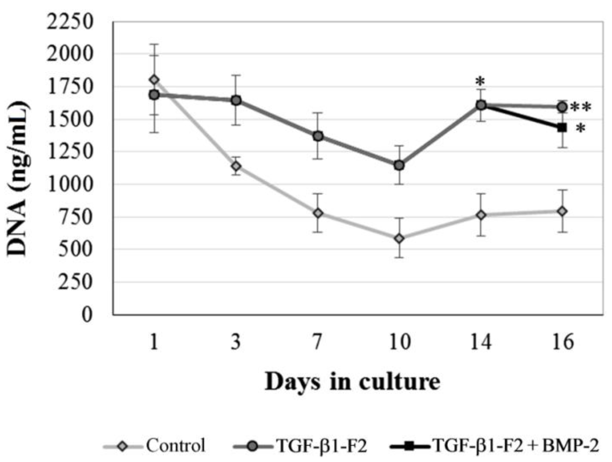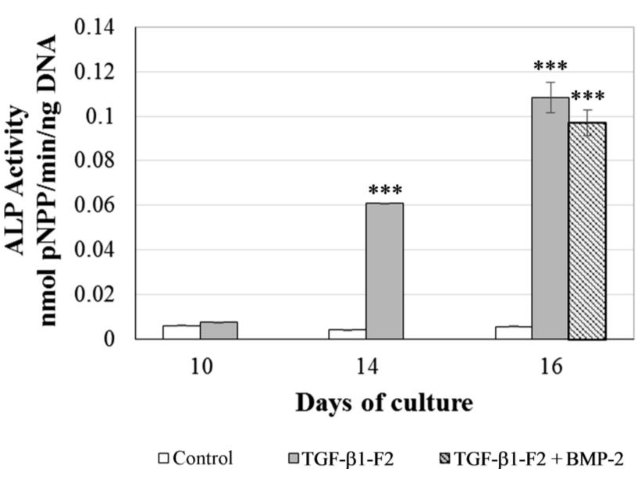 | TGF-β1-F2 + BMP-2 | 2.47 ± 0.21 *** |