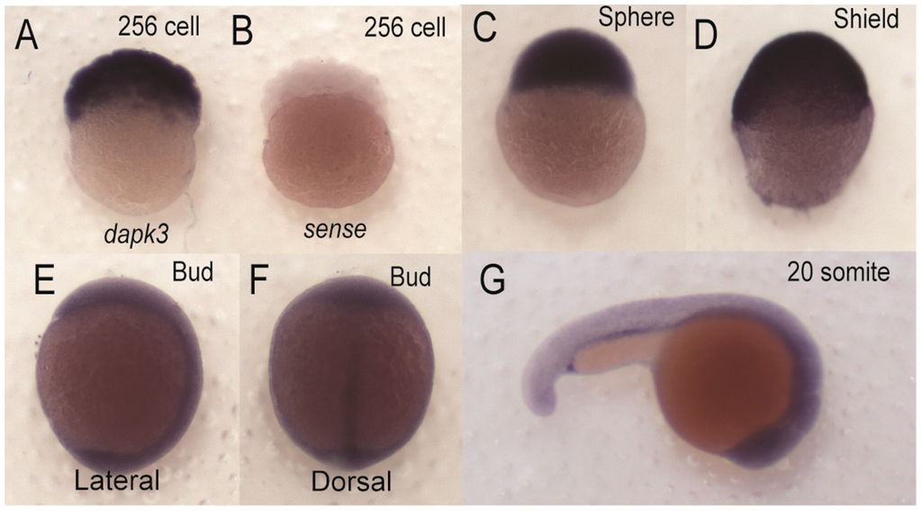 Spatial expression of zipk (dapk3) during early zebrafish development. Detection of zipk mRNA (dapk3) was carried out by whole-mount in situ hybridization using gene-specific probes on staged embryos at the 256 cells stage (A); sphere stage (C); shield stage (D); bud stage ((E) lateral view and (F) dorsal view); 20 somite stage (G); Negative control sense probes for zipk did not show staining at the 256 cell stage (B) or other stages (data not shown). Because of the difference in expression maternal stages (A–C) were developed for a shorter time than zygotic stages (D–G).