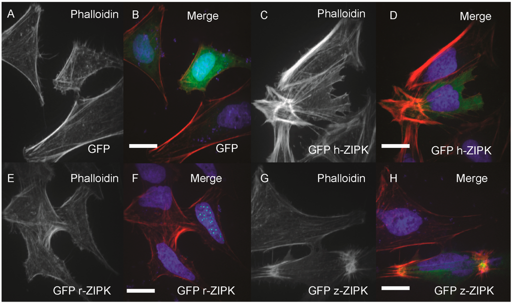 In order to examine the evolutionary conservation of ZIPK regulatory mechanisms we turned to heterologous expression in HeLa cells. Using the HeLa cells we could simultaneously analyze the effect on the actin cytoskeleton and take note of the subcellular localization of ZIPK. HeLa cells were transfected with either a vector-only GFP control, or GFP-tagged versions of the human, rat, or zebrafish orthologs of ZIPK. The cells were then fixed and stained with phalloidin to mark the actin cytoskeleton and DAPI to stain the nucleus. Heterologously expressed GFP was localized throughout the cell with noticeable enrichment in the nucleus, but resulted in no detectible change in the actin cytoskeleton relative to untransfected cells (Figure 4A,B; quantification in Figure S2). Expression of the human ortholog of ZIPK resulted in the accumulation of excessive as well as highly focused and disorganized stress fiber bundles (Figure 4C,D; quantification in Figure S2). In contrast, expression of the rat ZIPK resulted in accumulation of ZIPK in a punctate pattern in the nucleus and no detectible change in the actin cytoskeleton (Figure 4E,F; quantification in Figure S2). Zebrafish ZIPK was present in both the cytoplasm and nucleus and also resulted in an accumulation of excessive and highly focused stress fibers (Figure 4G,H; quantification in Figure S2). Similar results have been noted when a number of MLC2 kinases are overexpressed [14,30,31].