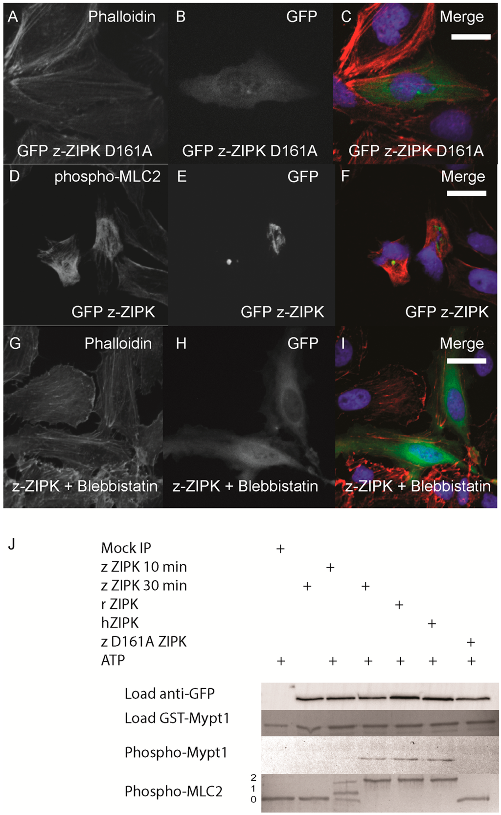 Zebrafish ZIPK controls the actin cytoskeleton by regulating type-II myosin (MLC2) phosphorylation. HeLa cells were transfected with a kinase dead D161A zebrafish GFP-ZIPK (A, B, C) and fixed and stained with DAPI and Alexa 568-phalloidin; HeLa cells were transfected with a zebrafish GFP-ZIPK (D, E, F) and immunostained using an anti-phospho myosin light chain 2 antibody, co-stained with DAPI; HeLa cells were treated with media containing either 0.1% DMSO (not shown) or 50 μM blebbistatin (G, H, I) for 4 h; Black and white images show phalloidin staining, while color images are a merge of DAPI (blue), GFP (green), and phalloidin (red). (J) Zebrafish, Rat and Human ZIPK immunoprecipitated from HEK 293T cells were used to phosphorylate purified GST-Mypt1 and GST-MLC2. Unphosphoryled (0), mono (1) and di-phosphorylation (2) MLC2 was detected by band shift using a phos-tag SDS-PAGE gel and stained with Coomassie. Phosphorylation of Mypt1 was detected using a phospho-specific antibody (T696). Each experiment was replicated a minimum of three times. White bar indicates a 20 μm scale bar.