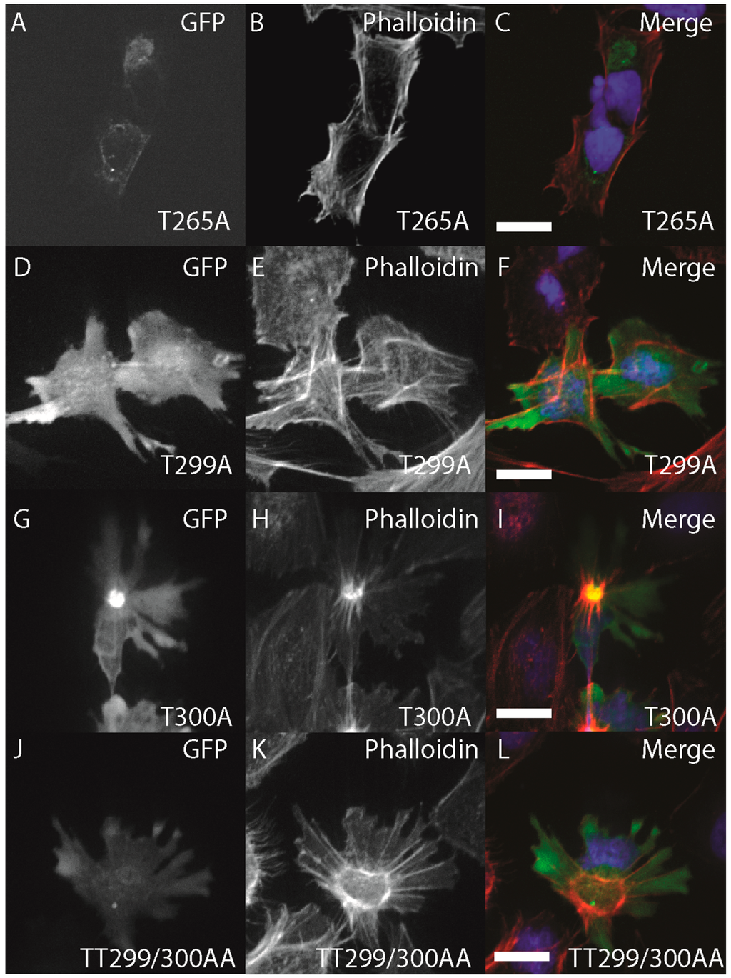 To characterize the conservation of ZIPK regulation by multi-site phosphorylation we used site-directed mutagenesis to generate a series of mutant zebrafish GFP-ZIPK lacking critical conserved phosphorylation sites. Mutation of T265 to alanine did not alter subcellular localization, but eliminated the ability of ZIPK to regulate the cytoskeleton (Figure 7A–C; quantified in Figure S2), indicating a conserved role of phosphorylation in the activation of zebrafish ZIPK. Mutation of T299A, T300A alone or in combination resulted in no observable change in localization or cytoskeletonal regulation (Figure 7D–L; quantified in Figure S2). Interestingly, expression of all three mutant ZIPK constructs resulted in accumulation of excess, focused stress fibers like the WT version (Figure 7D–L; quantified in Figure S2). The double mutant T299A/T300A ZIPK also increased immunocytochemical staining for phospho MLC2 (data not shown). This is in stark contrast to the human ZIPK, where mutation of T299 and T300 to alanines resulted in nuclear accumulation [19].