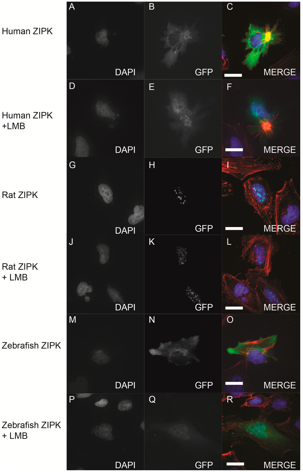 Nucleo-cytoplasmic shuttling of zebrafish ZIPK. HeLa cells were transfected with either human GFP-ZIPK (A–F); rat GFP-ZIPK (G–L); or zebrafish GFP-ZIPK (M–R). All cells were fixed and stained with DAPI and Alexa 568-phalloidin. The cells in (A–C, G–I, M–O) were treated with 0.1% DMSO; while the cells in (D–F, J–L, P–R) were treated with 50 nM leptomycin B for four hours. (A, D, G, J, M, P) are stained with DAPI; (B, E, H, K, N, Q) show subcellular localization of the GFP-fusion protein, while color images are a merge of DAPI (blue), GFP (green), and phalloidin (red). Each experiment was repeated three times with a minimum of 25 cells assayed per experiment. White bar indicates 20 μm.