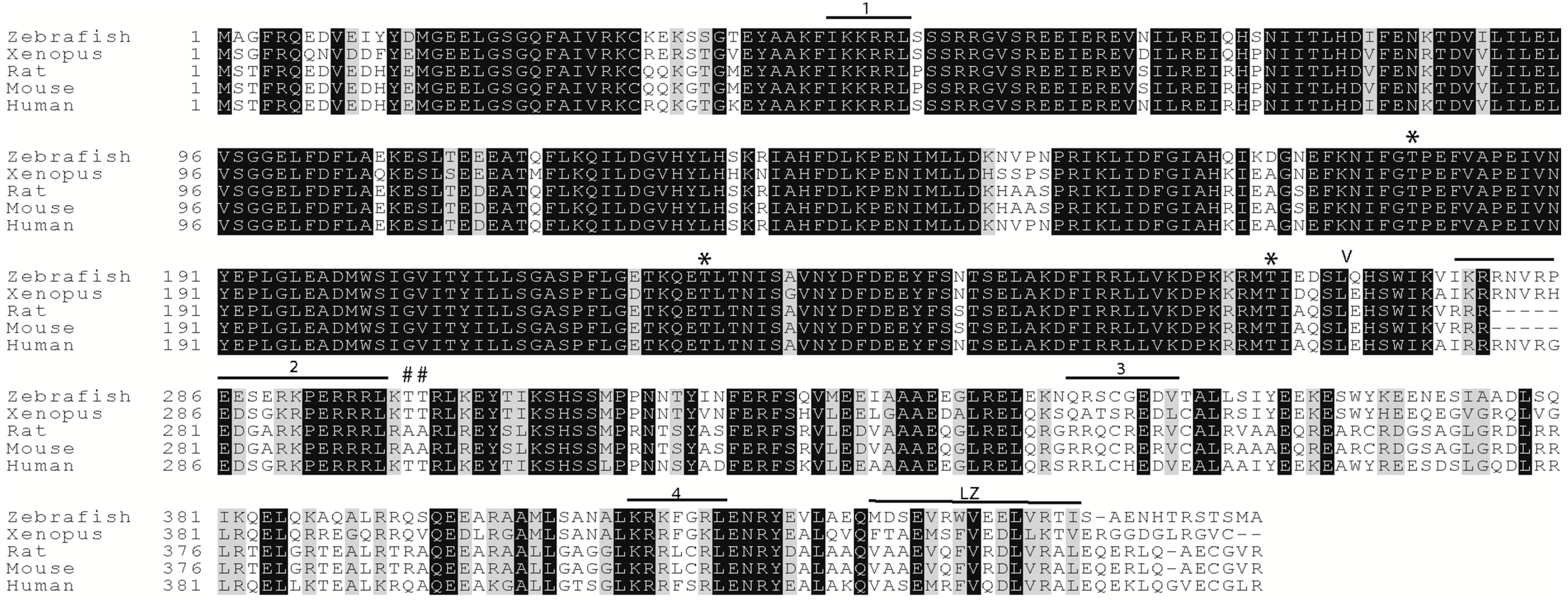 Conservation of regulatory domains of zipper-interacting protein kinase (ZIPK) homologs. A protein sequence alignment of zebrafish ZIPK with human and rat ZIPK; The amino acids marked with a * are phosphorylation sites required for kinase activation in the human ortholog; Amino acids marked with a # are phosphorylation sites that modulate nucleo-cytoplasmic shuttling in the human ortholog; Numbered regions indicate the four conserved nuclear localization sequences; LZ indicates the leucine zipper; amino acids N-terminal to the V are the kinase domain; accession numbers are available in the experimental section.