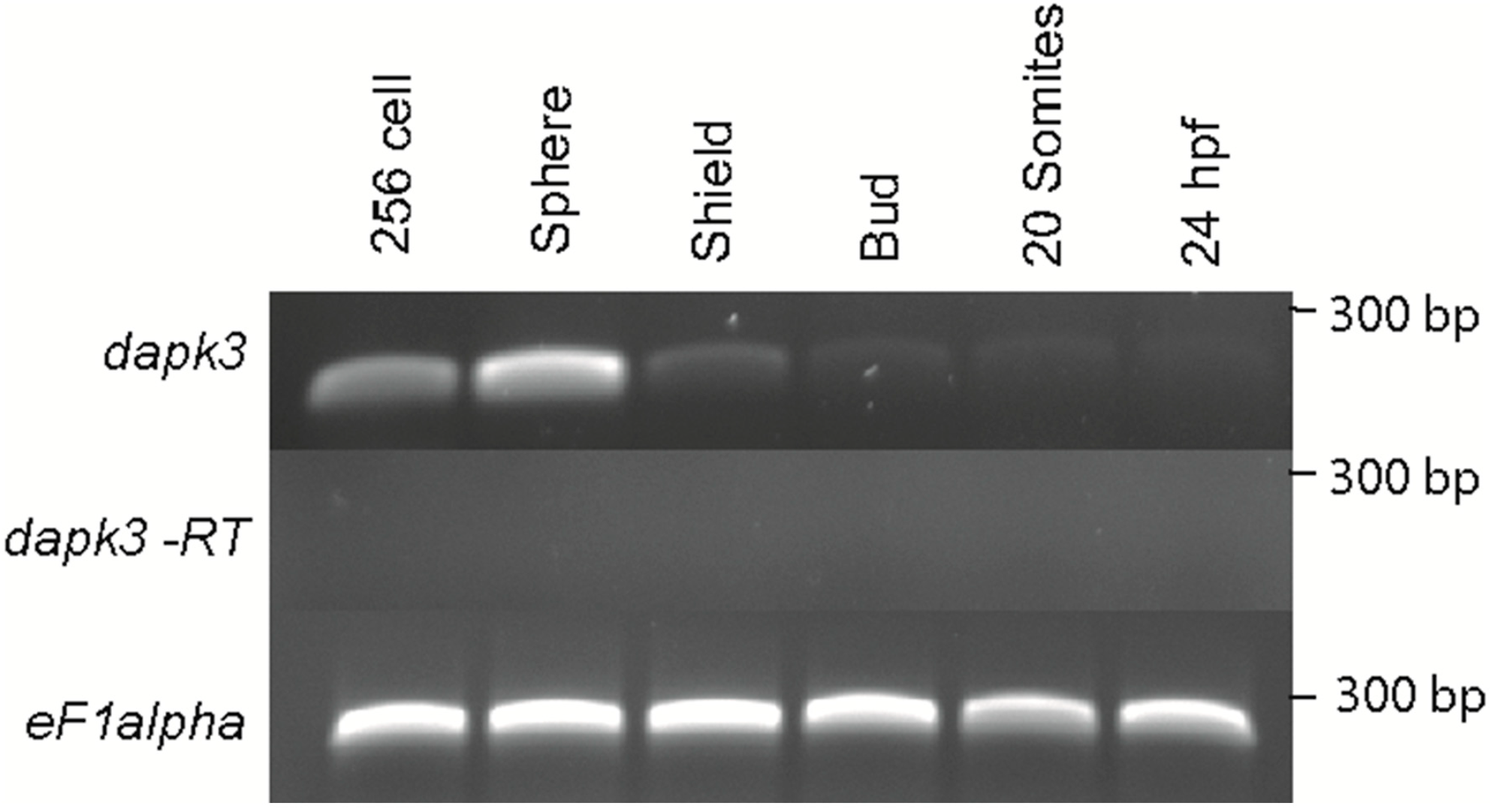 Temporal expression of zipk (dapk3) during early zebrafish development. Gene specific primers were used to detect zipk (286 bp) in various stages of development by RT-PCR. The zipk mRNA was expressed maternally and zygotically throughout early development. Amplification of eF1 alpha and total RNA without addition of reverse transcriptase were used as controls.