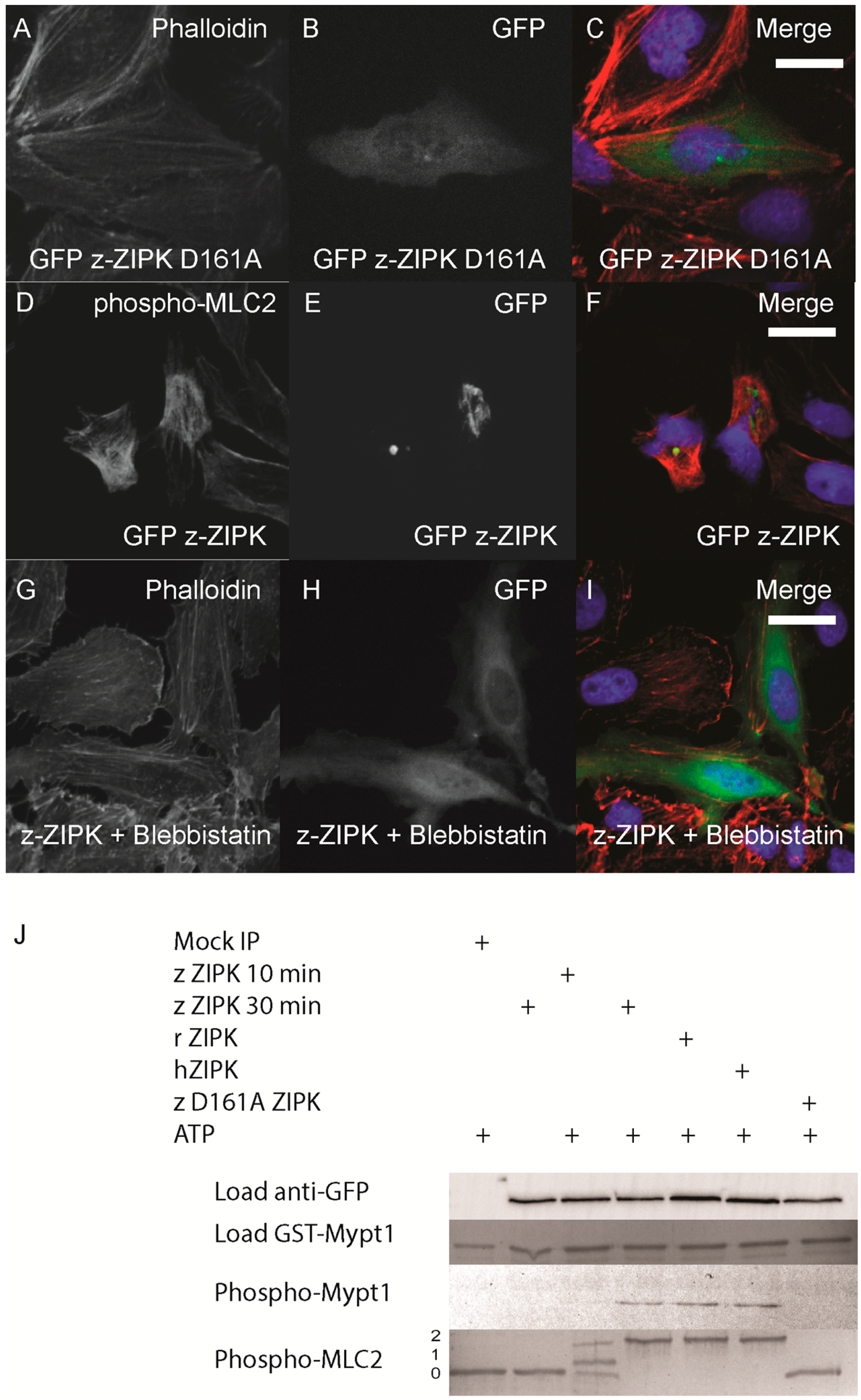 Figure 5G–I). Blebbistatin blocks myosin activity even if MLC2 is phosphorylated, indicating that the ZIPK stress fiber phenotype is indeed MLC2 dependent. Finally, we carried out