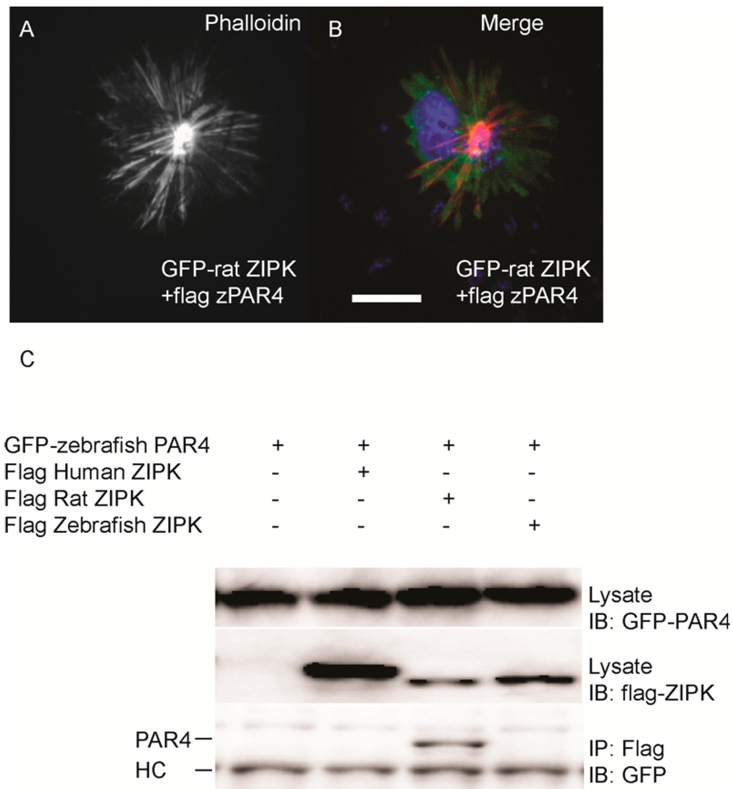 Differential interaction of ZIPK homologs with zebrafish PAR-4. HeLa cells were transfected with rat GFP-ZIPK and flag zebrafish PAR-4 (A, B). The cells were fixed and stained with DAPI and Alexa 568-phalloidin. Black and white images show phalloidin staining, while color images are a merge of DAPI (blue), GFP (green), and phalloidin (red).White bar indicates a 20 μm scale; (C) HEK293T cells were co-transfected with GFP-tagged zebrafish PAR-4 along with flag-tagged ZIPK from human, rat and zebrafish. Protein complexes were immunoprecipitated with anti-FLAG antibodies. The IPs were immunoblotted with anti-GFP antibodies and anti-FLAG antibodies. HC indicates the IgG heavy chain which is the same size as zebrafish and mouse ZIPK, while human is slightly heavier. Each experiment was repeated a minimum of three times.