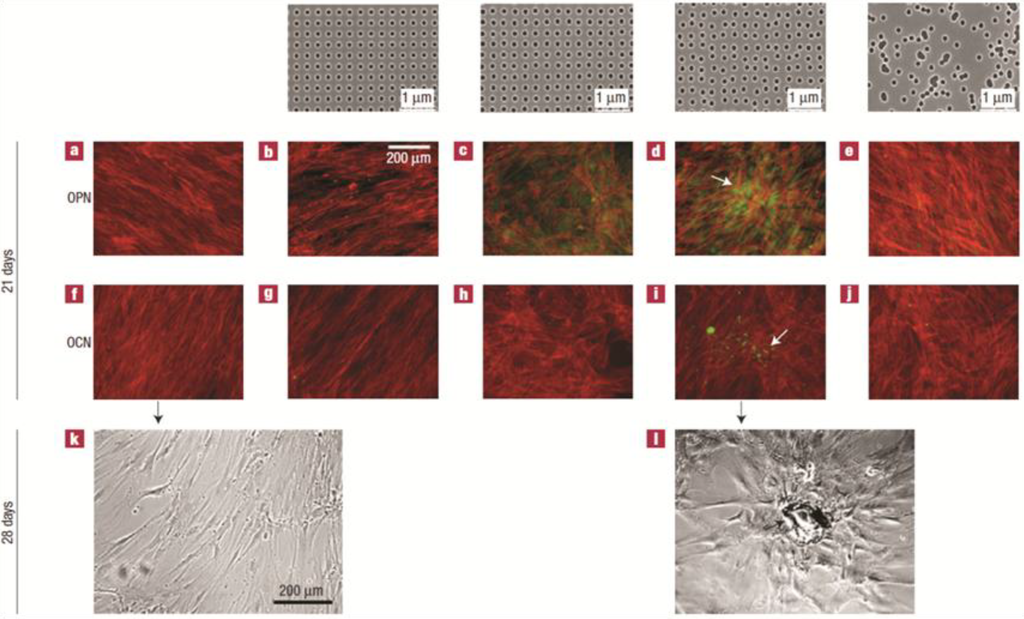 Mesenchymal stem cells (MSC) are sensitive to nanotopography and show enhanced osteogenic differentiation when cultured on surfaces with semi-ordered architecture. MSCs are cultured on planar PMMA (poly-methyl methacrylate) (a,f,k), PMMA surfaces with pits (120-nm-diameter and 100 nm deep) arranged in square arrays (300 nm apart) (a,g), PMMA surfaces with pits displaced +/−20 nm from perfect square arrangement (c,h), PMMA surfaces with pits displaced by +/−50 nm (d,i,l) and PMMA with completely randomly patterned pits. Top row show the nanotopography of the different PMMA surfaces. (a–e) Cells co-stained with alizarin-red and antibodies against osteopontin (OPN); (f–j) Cells co-stained with alizarin-red and antibodies against osteocalcin (OCN); (k–j) Phase contrast microscope image of MSCs grown on planar (k) and semi-ordered (J) PMMA surfaces. Note that MSCs grown on pits displaced by 20 and 50 nm show enhanced osteogenic differentiation and raised OCN and OPN with nodules forming in cells on 50 nm displaced surfaces (arrow in d and i). Cells grown on planar surfaces and surfaces with pits in ordered array show no osteogenic differentiation and maintain fibroblast morphology (a,b,f,j,k). This contrasts with bone nodules forming on cells grown on surfaces with pits displaced by 50 nm (arrow) (l). Reprinted from [47] with permission from Macmillan Publishers Ltd, copyright 2014.