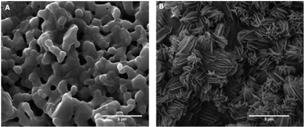 Calcium phosphate based ceramics attract natural apatite deposition on its surface after immersion in physiological solutions. This occurs through an ion exchange reaction between the calcium phosphate in the ceramic coating and the ions and proteins in the surrounding solution. SEM images of BCP (bi-phasic calcium phosphates) scaffolds before and after immersion in phosphate buffered saline (PBS). (A) HA/TCP scaffolds before immersion in PBS; (B) HA/TCP scaffolds after immersion in PBS for 2 weeks. Note the deposition of apatite crystals on the scaffold surface. Reprinted from [82] with permission from Bentham Open, copyright 2010.