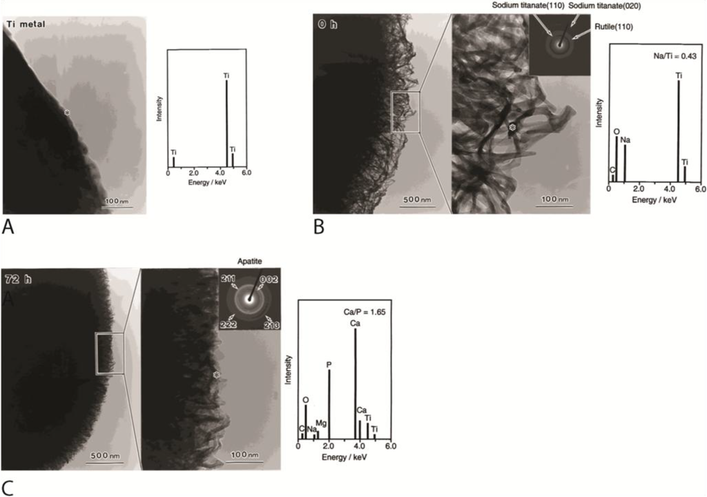 Functionalization of Titanium surfaces with hydroxyl (OH−) groups enhanced nucleation of bone like apatite on the metal surface when it is submerged in physiological solutions. The figure shows transmission electron microscopy (TEM) images and energy dispersive X-ray spectrometry (EDX) results of titanium surfaces treated with NaOH and heat followed by immersion in physiological solution. (A) Titanium surface before NaOH and heat treatment; (B) Titanium surface after NaOH and heat treatment. Note the layer of amorphous sodium titanate that forms on the titanium surface; and (C) NaOH and heat-treated titanium surface after 72 h immersion in physiological solution. Note the deposition of natural apatite on the implant surface. * Center of electron diffraction and EDX analysis. Reprinted from [62] with permission from John Wiley & Sons, Inc., Copyright 2014.