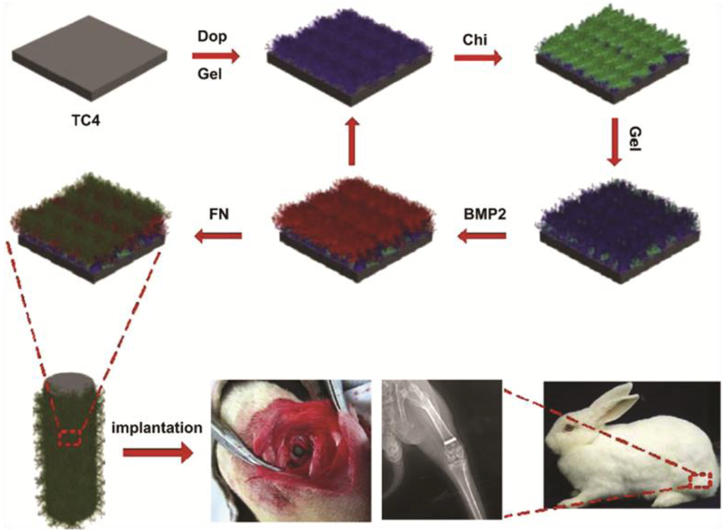 Schematic diagram showing production process of PEM consisting of layers of gelatin (Gel), chitosan (Chi), BMP2 and fibronectin (FN). Titanium alloy Ti6Al4V surfaces (TC4) is first coated with gelatin through dopamine (Dop) conjugation. This is followed by deposition of chitosan, BMP2 and fibronectin layers. Titanium rods coated with these PEM promote osteointegration when inserted into the femur of rabbits. Bottom row images show PEM coated titanium rods in the rabbit femur 4 weeks after implantation. PEM is a versatile and efficient means of complexing a range of biomolecules to metal surfaces. Image adapted from [192] with permission from Elsevier, Copyright 2014.