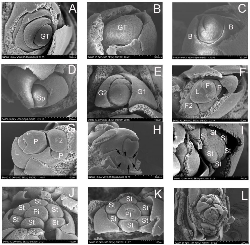 2.1. Morphological Studies of the Transition from the Vegetative Bud to Inflorescence Initiation and Flower Ontogeny