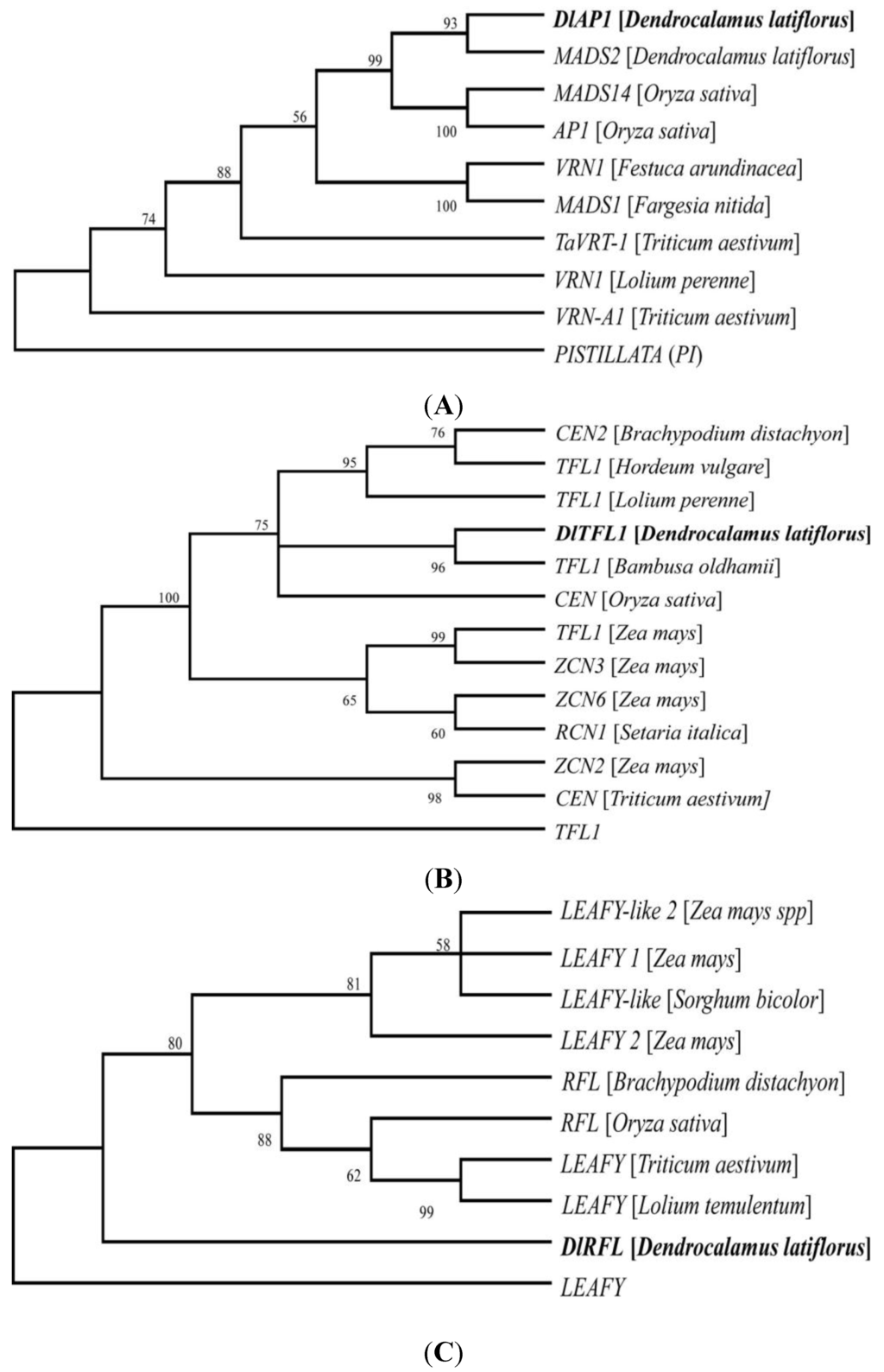 3.5. Sequence and Phylogenetic Analysis of Meristem Genes (DlAP1, DlTFL, DlRFL)