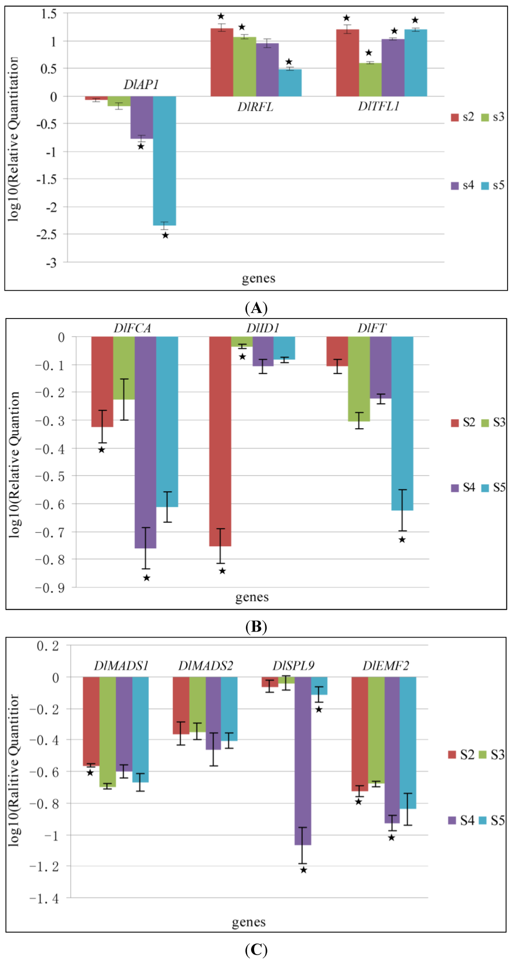 2.3. Quantitative Expression Patterns of the Ten Candidate Genes from Floral Transition to Early Floral Development