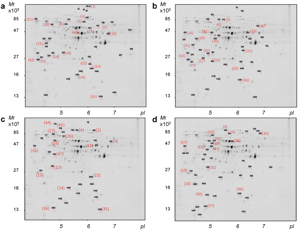 Representative phosphoproteome map showing the proteins with significant changes (a) in the S. cerevisiae W303-1A haploid strain after treatment with cisplatin; (b) in the W303-1A-derived Δsky1 mutant after treatment with cisplatin; (c) in the W303-1A strain versus its Δsky1 mutant; (d) in the W303-1A strain versus its Δsky1 mutant, after treatment with cisplatin. Proteins were resolved in the 3–11 (nonlinear) pH range in the first dimension and on 12% acrylamide gels in the second dimension. Proteins identified by MALDI (Matrix-assisted laser desorption/ionization)-TOF (Time of Flight)/TOF mass spectrometry are listed in Table 1, where ID numbers correspond to the numbered spots in this figure (red numbers in brackets).
