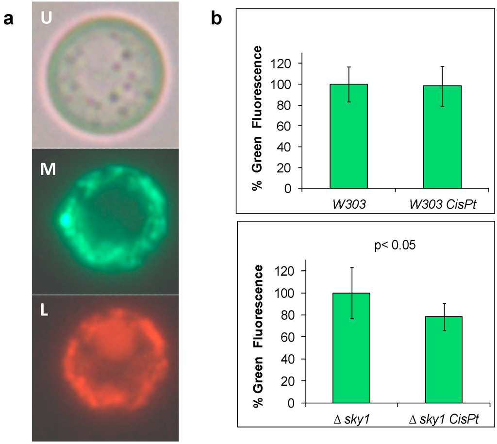 Mitophagy in W303-1A (W303) and ∆sky1 strains after cisplatin (cisPt) treatment. (a) Visualization (objective 100×) of mitophagy in W303 cells treated with 1200 µM cisplatin; U, Bright field; M, Green channel for phluorin; L, Red channel for the Ds. Red T3 protein; (b) Quantification of the green fluorescence.