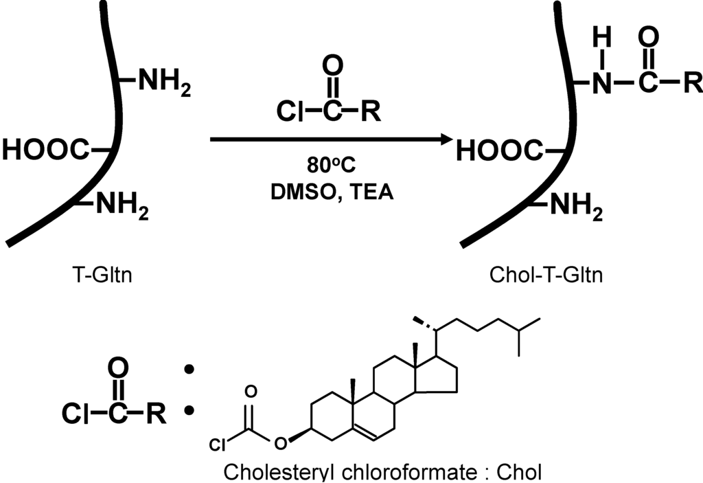 Modification of T-Gltn with Chol groups was carried out using a reaction between the active ester of cholesteryl chloroformate with the primary amine of T-Gltn . Briefly, a mixture of T-Gltn (40 g) and TEA (5 mL) in DMSO (495 mL) was stirred at 80 °C. Powdered cholesteryl chloroformate was then added to the T-Gltn solution. The mixture continued to be stirred under an N2 atmosphere at 80 °C overnight. The resulting Chol-T-Gltn was precipitated by adding three volumes of cold ethanol. Precipitates were subsequently washed three times with 1.5 L of ethyl acetate in order to remove unreacted cholesteryl chloroformate and DMSO. The resulting solid was dried at 25 °C to leave a white cake.