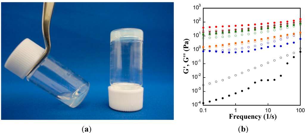 Assembly of liposome with Chol-T-Gltns. (a) Photograph of Dimethyldioctadecylammonium bromide (DODAB) liposome solution (20 mM) before (left) and after (right) addition of Chol-T-Gltn with high Chol content (69Chol-T-Gltn) (20 w/v %); and (b) Storage modulus G' (closed symbol) and loss modulus G'' (open symbol) of mixture solution of liposome with Chol-T-Gltns as a function of frequency at 37 °C. Chol contents of T-Gltns were 0 (●,○), 3 (●,○), 11 (●,○), 19 (●,○), 44 (●,○), and 69 (●,○) mol %, respectively.