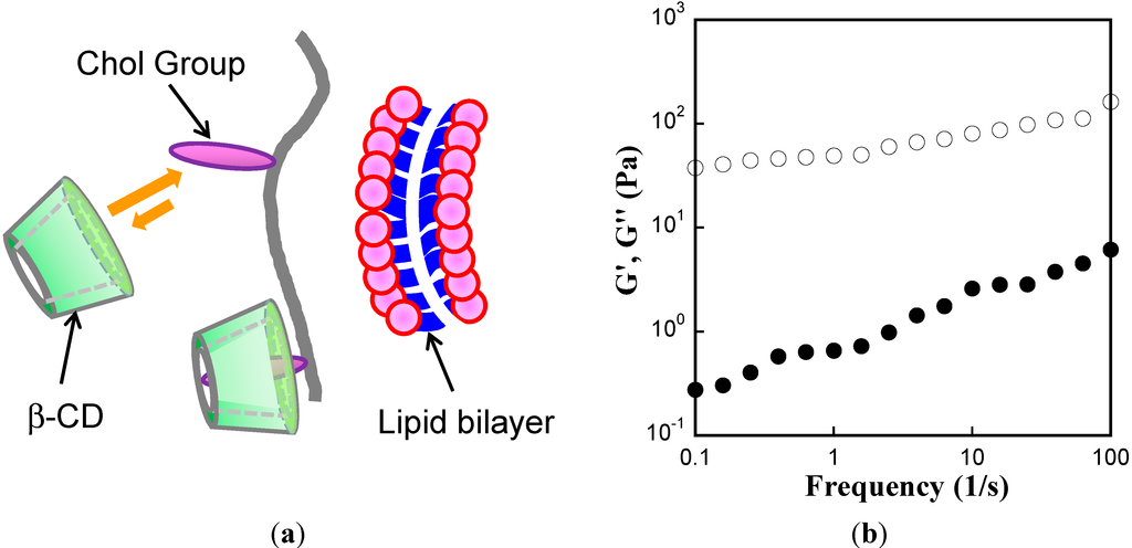 Prevention experiment of liposome gel formation by addition of β-cyclodextrin (β-CD). (a) A schematic illustration of capping Chol groups in Chol-T-Gltn by β-CD; and (b) Storage modulus G' (●) and loss modulus G'' (○) of DODAB liposome gel as a function of frequency at 37 °C. Concentrations of DODAB liposome, 69Chol-T-Gltn and β-CD were fixed at 20 mM, 20 w/v % and 23.5 mM, respectively.