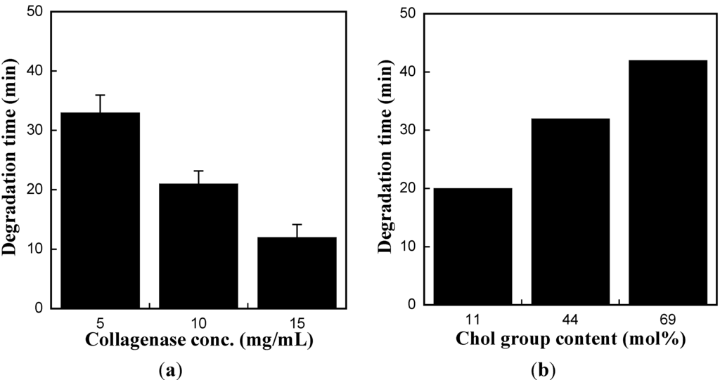 Enzymatic degradation study of Chol-T-Gltn crosslinked DODAB liposome gel. (a) Effects of collagenase concentration on degradation time. Data are means ± SD of three samples. 40 w/v % 44Chol-T-Gltn solution was mixed with 40 mM DODAB liposome solution. Mixing ratio was 1/1 (v/v); and (b) Effects of Chol group content on degradation time. Collagenase concentration was fixed at 5 mg/mL.