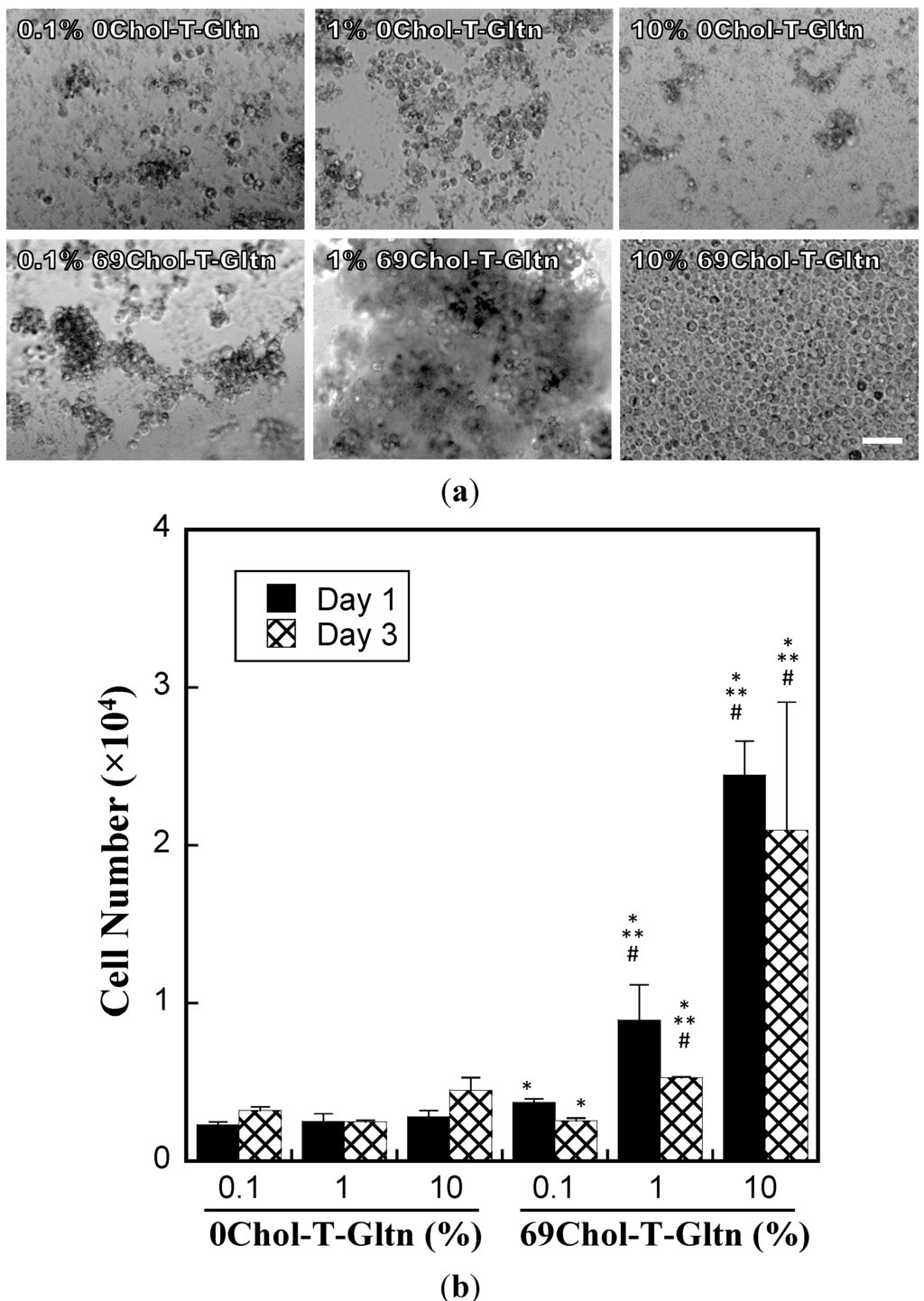 Assembly of HepG2 cells by addition of 0Chol-T-Gltn or Chol-T-Gltn with high Chol content (69Chol-T-Gltn). (a) Phase contrast micrograph of HepG2 cells after addition of 0Chol-T-Gltn or 69Chol-T-Gltn with various concentrations.Scale bar = 50 μm; and (b) Number of HepG2 cells after culture for 1 or 3 days at different 0Chol-T-Gltn or 69Chol-T-Gltn concentrations. Data are means ± SD of three samples. * p < 0.05 vs. same concentration of 0Chol-T-Gltn; ** p < 0.05 vs. 0.1% 69Chol-T-Gltn (Day 1); # p < 0.05 vs. 0.1% 69Chol-T-Gltn (Day 3).