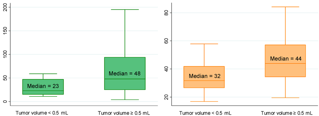 | Total tumor volume (mL) a n = 153 | <0.5 n = 19 (12%) | 6.2 (4.1–10.1) | 0.276 | 23 (15–47) | 0.004 | 14 (1–105) | 0.090 | 32 (27–42) | 0.002 |