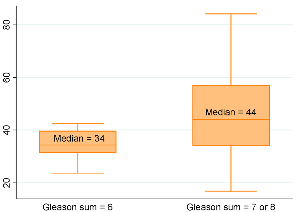 | Gleason stage n = 154 | G6 n = 22 (14%) | 6.5 (4.6–11.0) | 0.739 | 47 (23–81) | 0.897 | 38 (6–148) | 0.123 | 34 (31–40) | 0.013 |