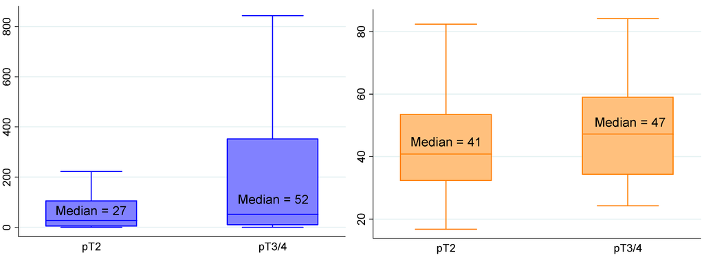 | Pathological T stage n = 154 | pT2 n = 106 (69%) | 6.5 (5.0–9.0) | 0.467 | 47 (23–82) | 0.724 | 27 (5–106) | 0.027 | 41 (32–53) | 0.086 |
