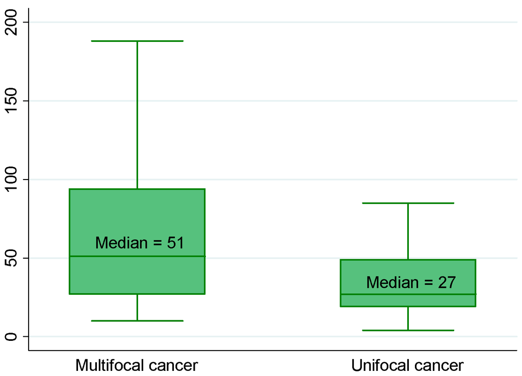 Median PCA3 score according to number of prostate cancer foci (p = 0.002). Biological and pathological findings in 154 men who underwent radical prostatectomies for prostate cancer.(See the note in the legend of the Figure 1 for complete explanation of how to read the figure).
