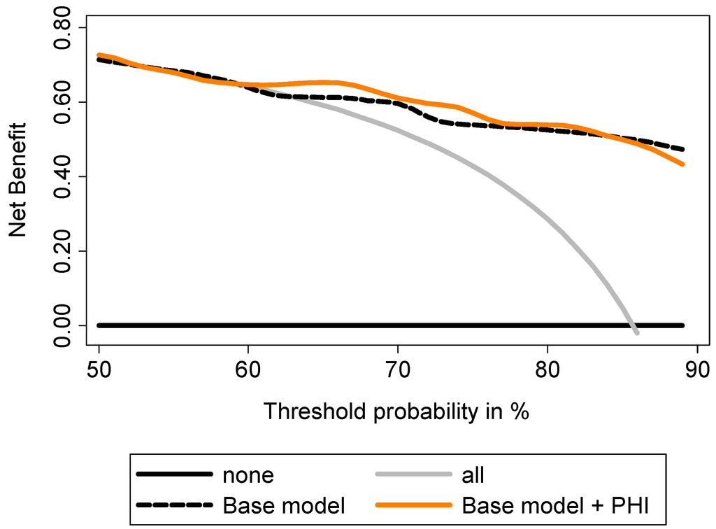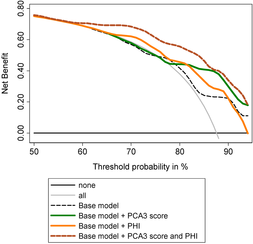 Evaluation of the ability of PHI to predict Gleason sum ≥7 using decision curve analysis. Base model: age, DRE findings, total serum PSA and Gleason sum at biopsy.