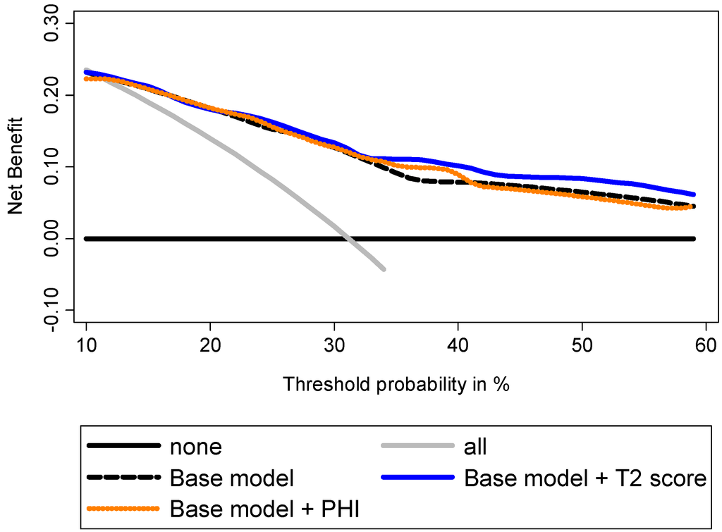 Evaluation of the ability of PHI and T2 score to predict extracapsular extension using decision curve analysis. Base model: age, DRE findings, total serum PSA, and Gleason sum at biopsy.