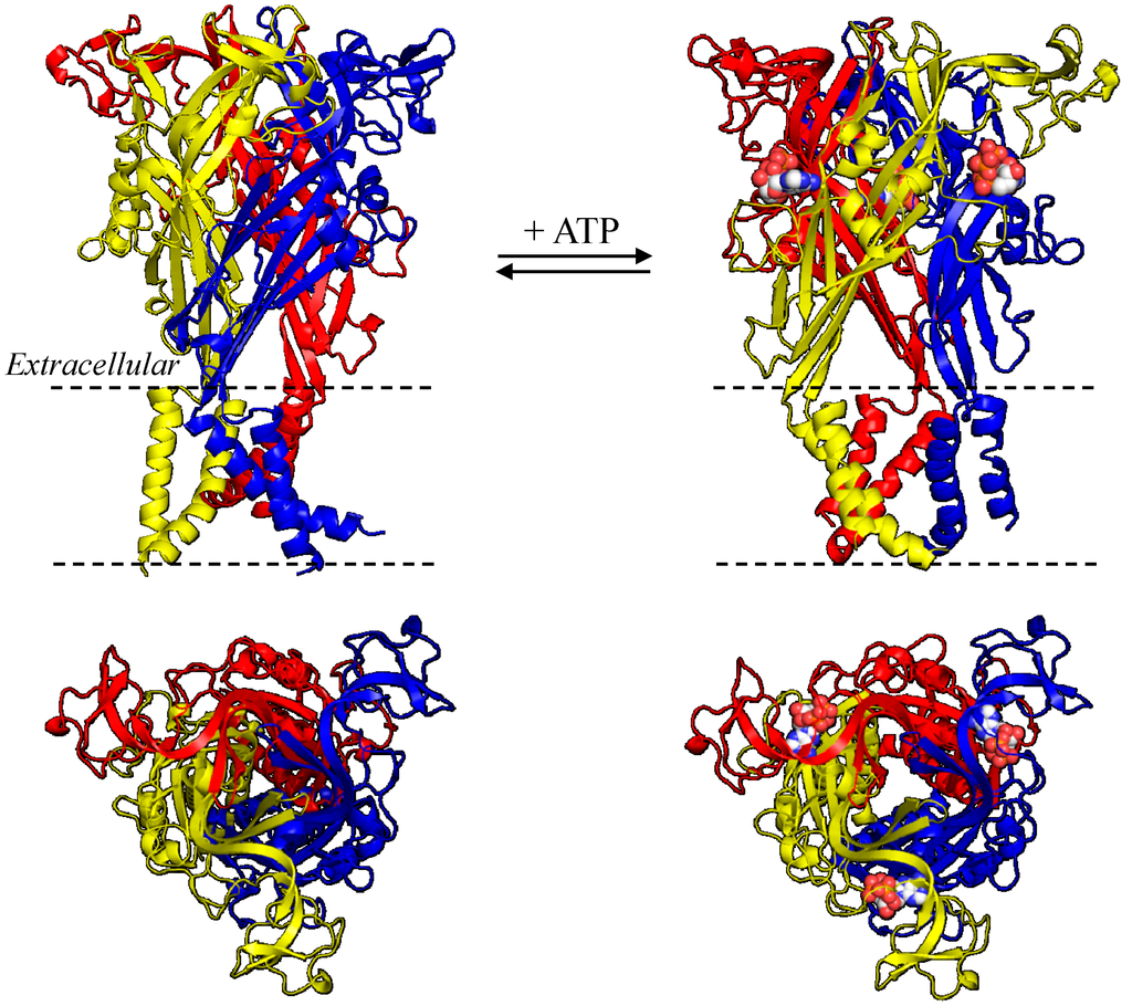 Structural homology models of the trimeric human P2X7 receptor. (Left) closed state; and (right) ATP-bound open state, viewed parallel to the plasma membrane (top) or the extracellular side (bottom). The three subunits are denoted in different colours, and the three bound ATP molecules are highlighted in spheres.