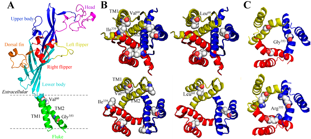 Structural homology models of the human P2X2 receptor. (A) The dolphin-like structure of a single receptor subunit in the closed state is shown with distinctive body parts in different colours, and Val60 in the extracellular end of TM1 and Gly353 in the intracellular half of TM2 are highlighted; (B) Changes in the distance between Val60 and Ile339 (left) and structural differences introduced by the V60L in the closed (top) and open states (bottom) viewed from the extracellular side of the membrane; and (C) Structural differences introduced by mutating Gly353 (top) to arginine (bottom) in the open state viewed from the cytoplasmic side of the membrane. TM: transmembrane domains.