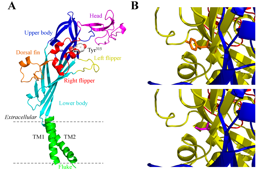Structural homology models of the human P2X4 receptor. (A) the dolphin-shaped structure of a single receptor subunit in the closed state shown with distinctive body parts in different colours (the same colour scheme used in Figure 2A for the human P2X2 receptor subunit) and the location of Tyr315 highlighted;and (B) views of Tyr315 (orange; top) and Cys315 (magenta, bottom) in the close proximity to the ATP-binding site in the open state.