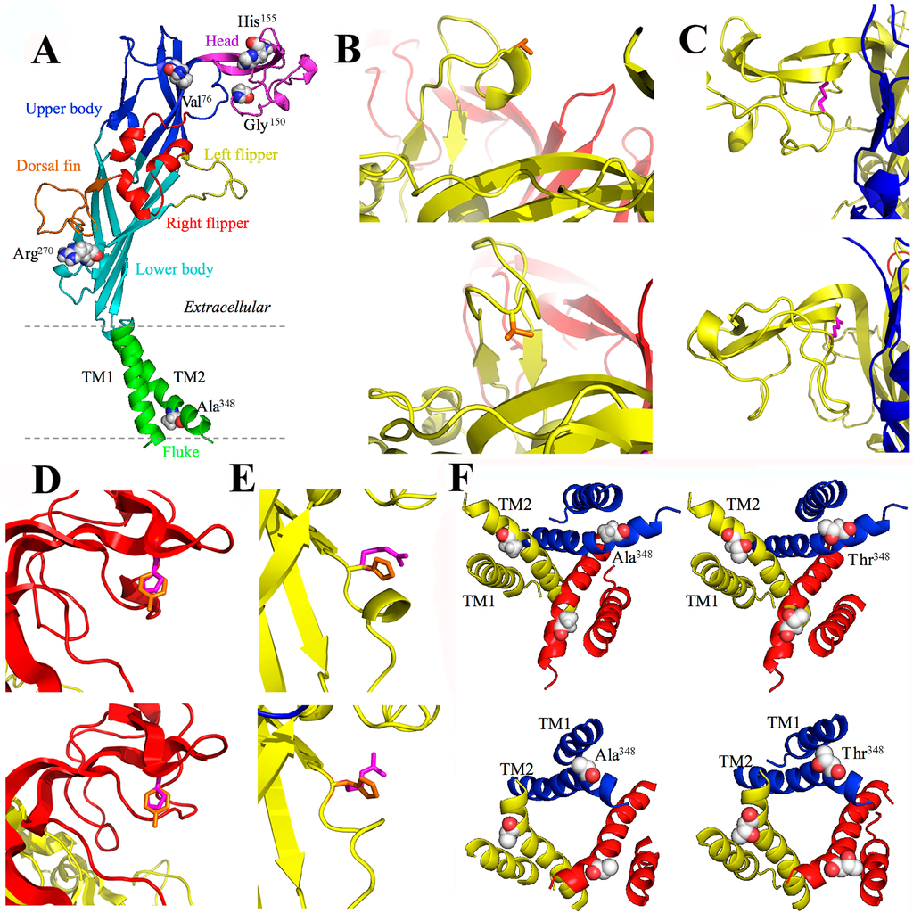 Structural homology models of the human P2X7 receptor. (A) the dolphin-shaped structure of a single receptor subunit in the closed state is shown with distinctive body parts in different colours (the same colour scheme used in Figure 2A and Figure 3A for the human P2X2 and P2X4 receptor subunits) and location of the residues to be mutated by disease-associated NS-SNPs are highlighted; (B–F) structural differences introduced by the V76A (B), G150R (C), H155Y (D), R270H (E), and A348T mutation (F) in the closed (top) and open state (bottom). The original residues are shown in orange and the substituted residues in magenta in (B–E). (F) is viewed from the cytoplasmic side of the membrane.