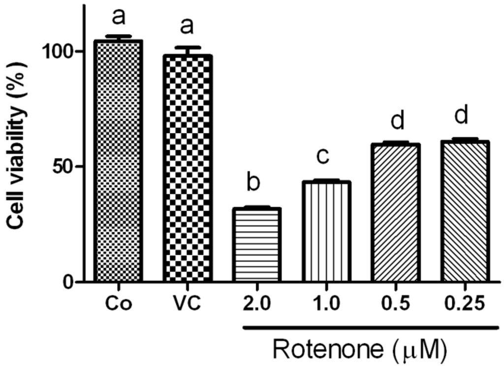 To define the adequate dosage of rotenone for inducing a targeted ~50% cell death, HT22 cells were incubated with four different concentrations (0.25, 0.5, 1.0, 2.0 µM) of rotenone for 24 h. As shown in Figure 1, cell viability decreased with increasing concentrations of rotenone. Naïve (Co) and vehicle (VC, 0.1% DMSO) treated control cells had a viability close to 100%. Rotenone at 0.25 and 0.5 µM resulted in 40% cell death, while rotenone at 2 µM caused 70% cell death. Viability was about 50% in the 1.0 µM rotenone group. As a result, this 1.0 µM rotenone was selected for subsequence experiments.