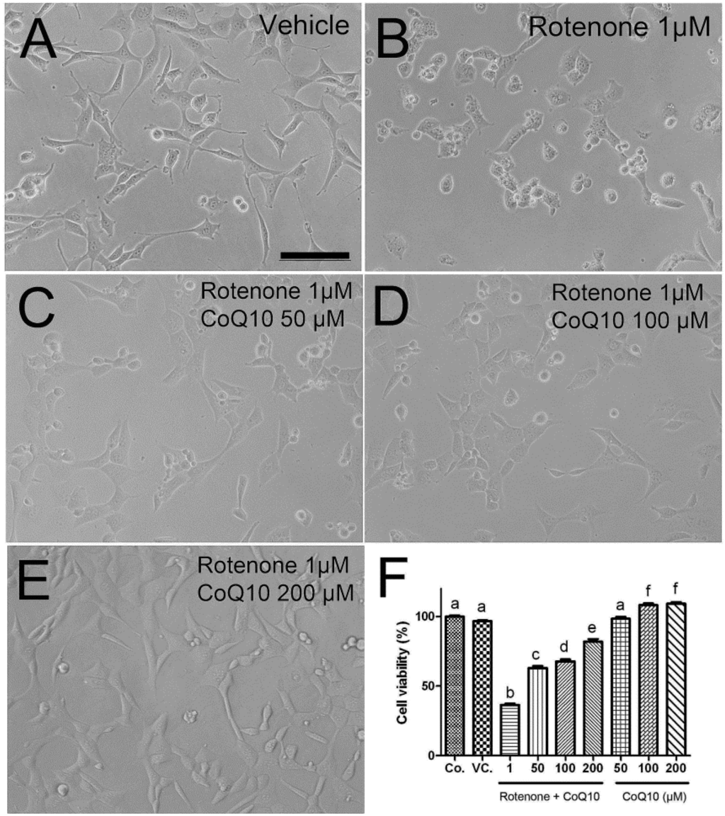 Cell viability in rotenone and CoQ10 incubated HT22 cells. (A–E) representative photomicrograms showing cell morphology after 24 of rotenone and/or Co-Q10 treatments; (F) a summarizing bar graph showing cell viabilities in naïve control (Co), vehicle control (VC), rotenone (1 µM) + Co-Q10 (50–200 µM) and Co-Q10 (50–200 µM) without rotenone groups. Data were collected from 3 independent experiments and presented as means ± s.d. Groups with same letter labeled on the top indicate no significant difference while groups with different letter suggest a statistical significance when compared among the groups (p < 0.01). Bar = 200 µm.