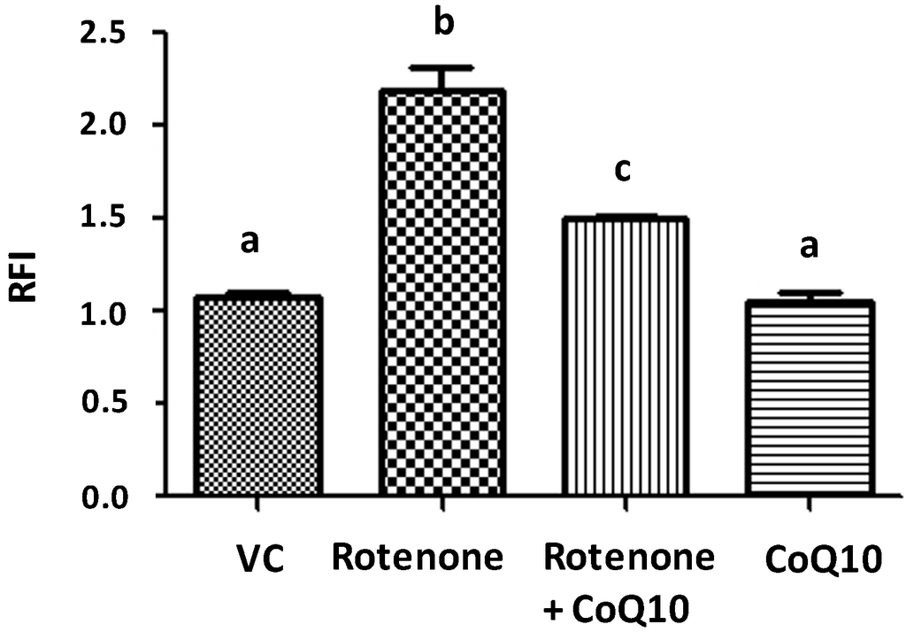 Measurement of ROS level by DHE. Rotenone increased while CoQ10 decreased ROS levels. Data were collected from 3 independent experiments and presented as means ± s.d. Groups with same letter labeled on the top indicate no significant difference while groups with different letter suggest a statistical significance when compared among the groups (p < 0.01 b vs. a and p < 0.05 c vs. b).