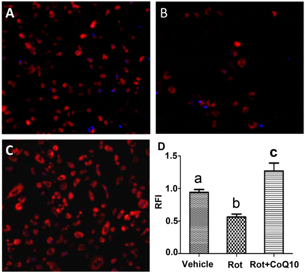 Mitochondrial membrane potential measured by TMRM. (A–C) representative images collected from (A) control, (B) rotenone-treated and (C) CoQ10 plus rotenone treated cells; (D) a summarized bar graph showing depolarization of mitochondrial membrane potential in rotenone-treated cells and preventive effect of CoQ10. Data were collected from 3 independent experiments and presented as means ± s.d. p < 0.01 b vs. a; p <0.05 c vs. a. Red color denotes TMRM staining and blue for DAPI.