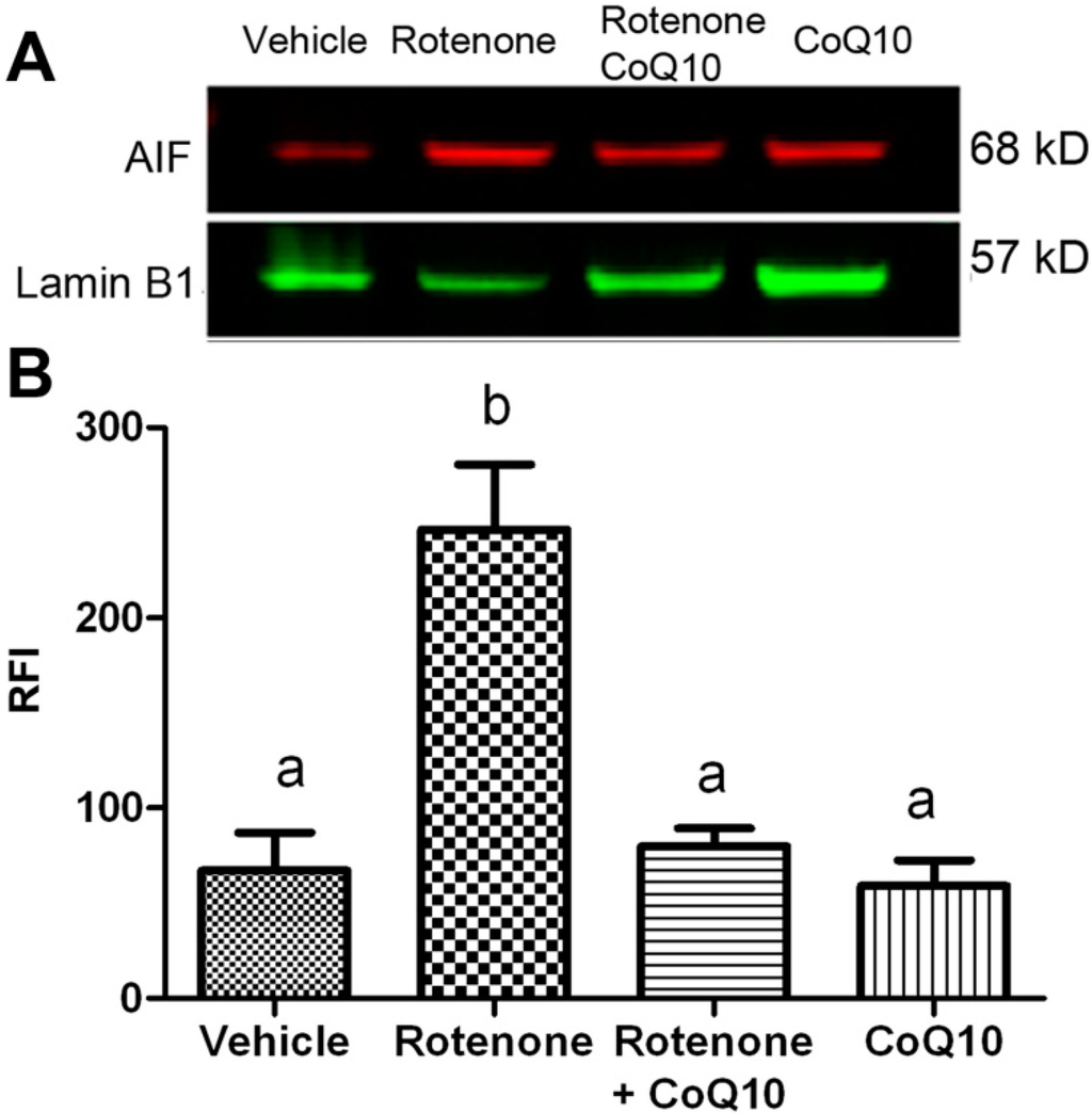 AIF normally localized in the mitochondria. When cells are under stress or injury conditions, AIF relocated to the nuclei where it causes DNA and nuclear envelope damage. Our results showed that rotenone increased AIF level in the nuclear fraction after 24 h of incubation. Treatment of rotenone-incubated cells with 200 µM water soluble CoQ10 significantly reduced the protein level of AIF in the nuclear fraction (Figure 5), suggesting a blockade of AIF nuclear translocation by the CoQ10.