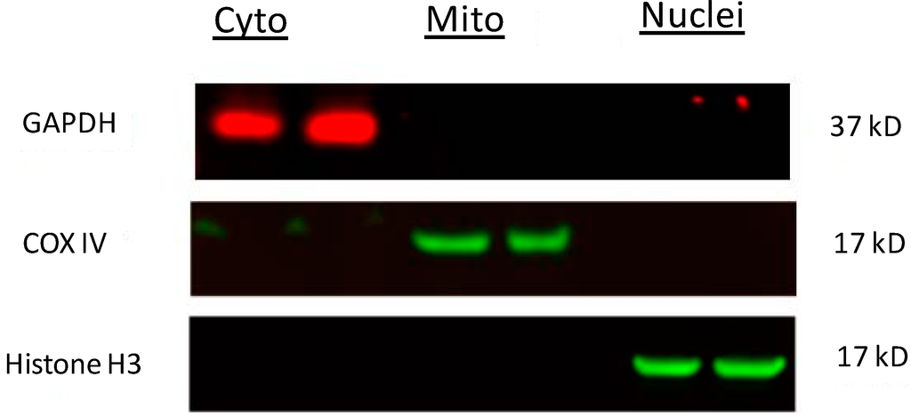 Western blots showing purity of subcellular fractions. Cytosolic, mitochondrial and nuclear fractions were isolated according to the protocol described in the Experimental section and equal amount of proteins (20 µg) were loaded side by side on the same gel. The membrane was probed separately with three primary antibodies against GAPDH, COX IV and Histone H3. A single band for GAPDH at approximately 37 kD in the cytosolic fraction, an obvious band for COX IV at approximately 17 kD in the mitochondrial fraction, and a band for Histone H3 closing to 17 kD in the nuclear fraction was observed. There was no obvious contamination among different fractions.