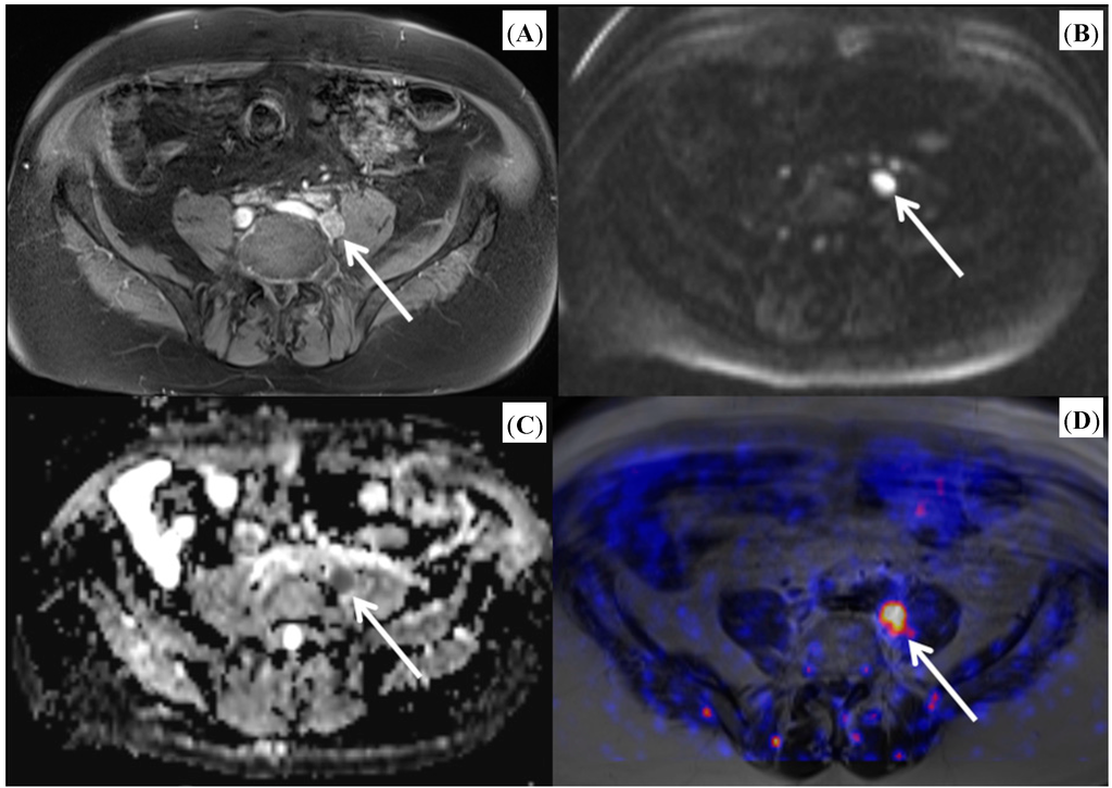 Patient with a lymph node metastasis from prostate cancer. (A) T1-weighted image after administration of contrast medium showing an enlarged left iliac lymph node with contrast enhancement; (B) Diffusion-weighted images revealing a diffusion restriction of the lymph node indicated by a hyper-intense signal; (C) Corresponding apparent diffusion coefficient (ADC) map with hypo-intense depiction of the lymph node; (D) Fused PET/MR image with pronounced choline uptake of the lymph node. (Arrows indicate lymph node metastasis).