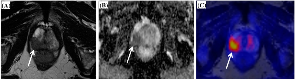 Patient with biopsy proven prostate carcinoma (Gleason score 4 + 3 = 7). (A) T2-weighted image presenting a hypo-intense lesion of the right peripheral zone; (B) ADC map indicating restricted diffusion within the tumor; (C) Fused PET/MR image depicting pathologically increased choline uptake of the tumor. (Arrows indicate prostate carcinoma).